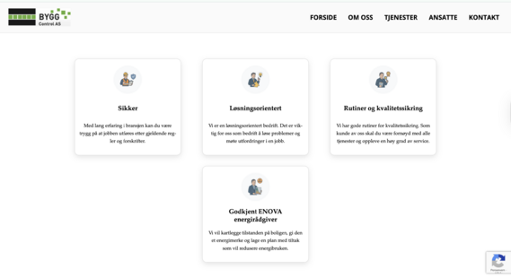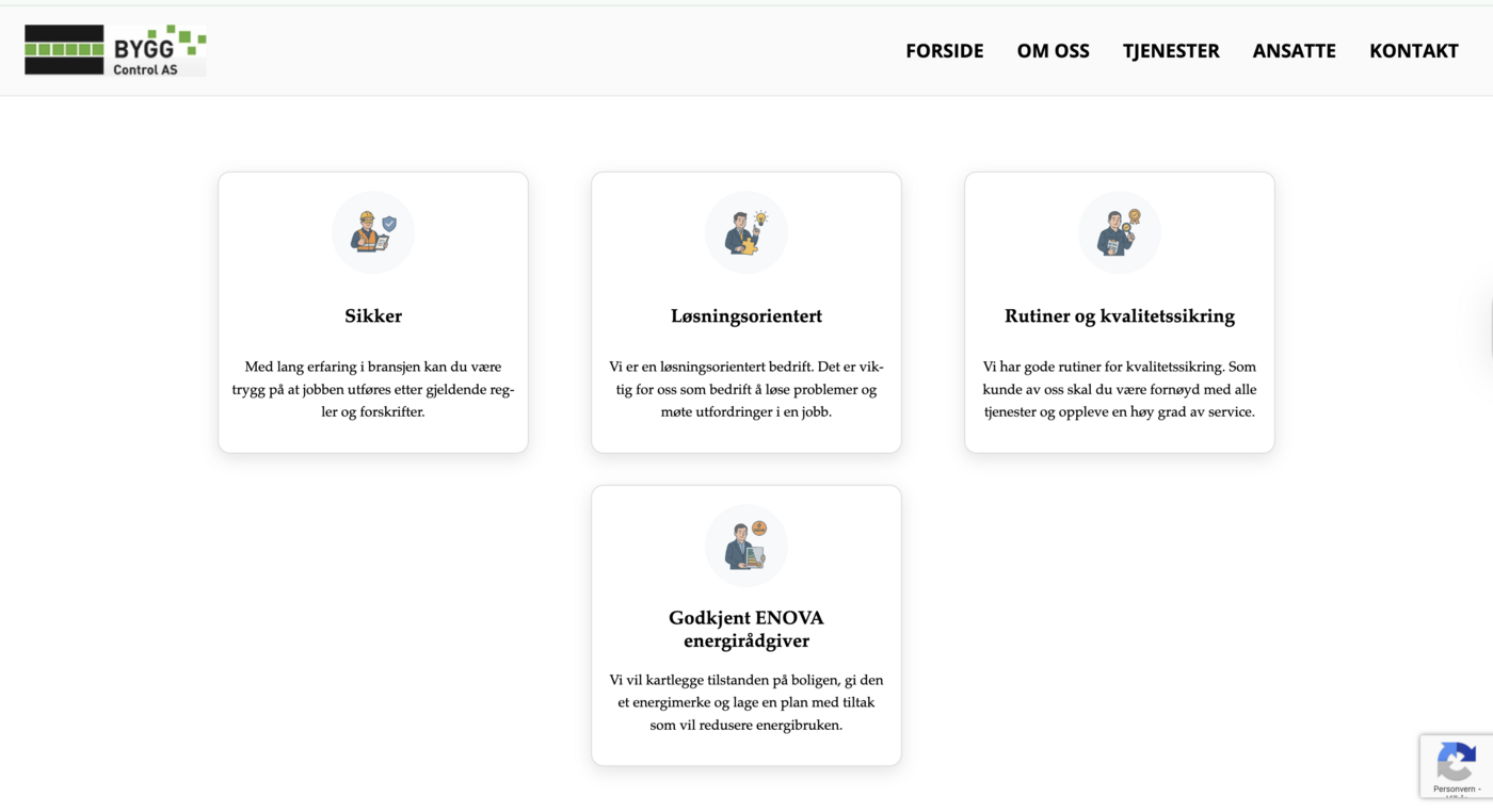 Nettsiden har et rent og profesjonelt uttrykk med kortbaserte tjenesteseksjoner, hero-bilder fra byggebransjen og tydelig fremheving av godkjenninger.