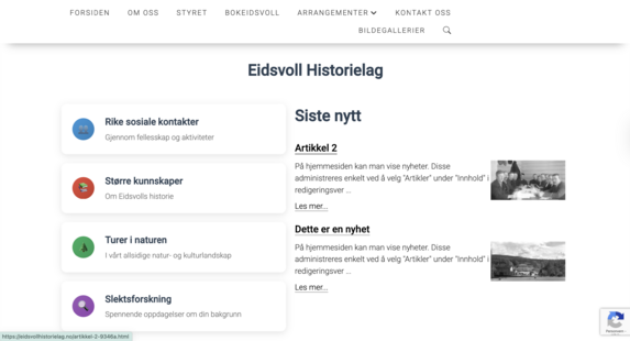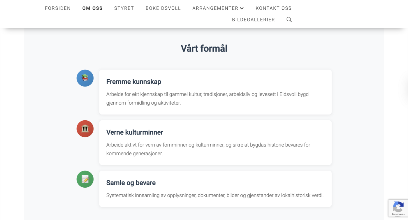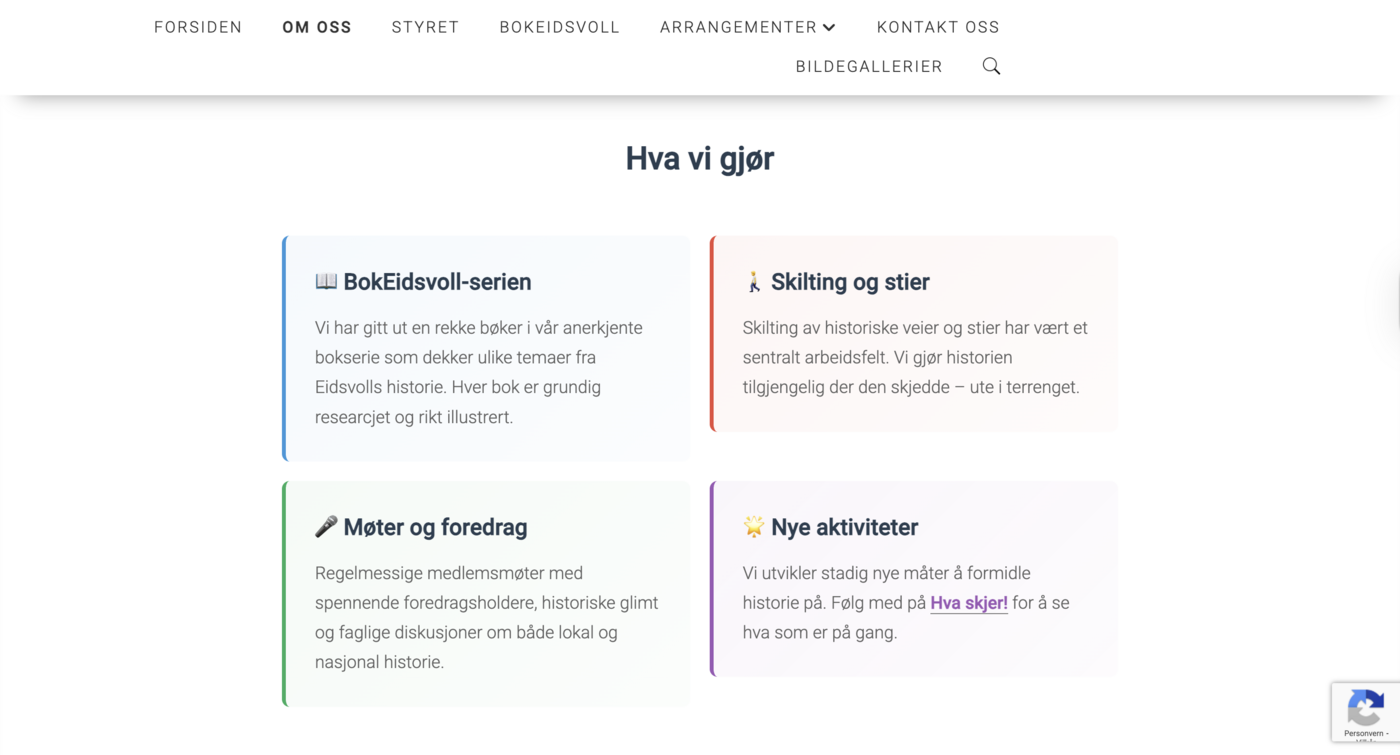 Eidsvollhistorielag.no er et godt eksempel på hvordan vi bruker AI til å lage nettsider som fungerer for alle aldersgrupper. Historielaget har mange eldre medlemmer, så det var viktig at siden skulle være lettfattelig og ikke for teknisk, samtidig som den skulle se moderne ut.