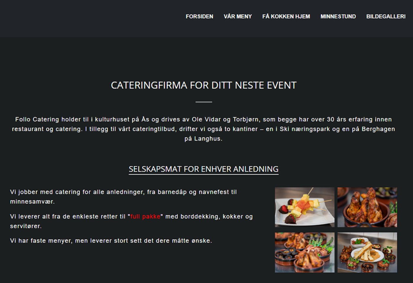 Follo Catering AS Klikk her for å komme direkte til nettsiden og gå hit for å se hvordan den vises på en mobiltelefon. Follo Catering AS bruker en one-page sidemal som er tilpasset kundens logo og design. Del denne siden med andre! Ditt navn: Din epost: Mottakers navn: Mottakers epost: Klarte ikke å laste inn Facebook-feeden.Klikk her for å gå til Facebook-siden vår!
