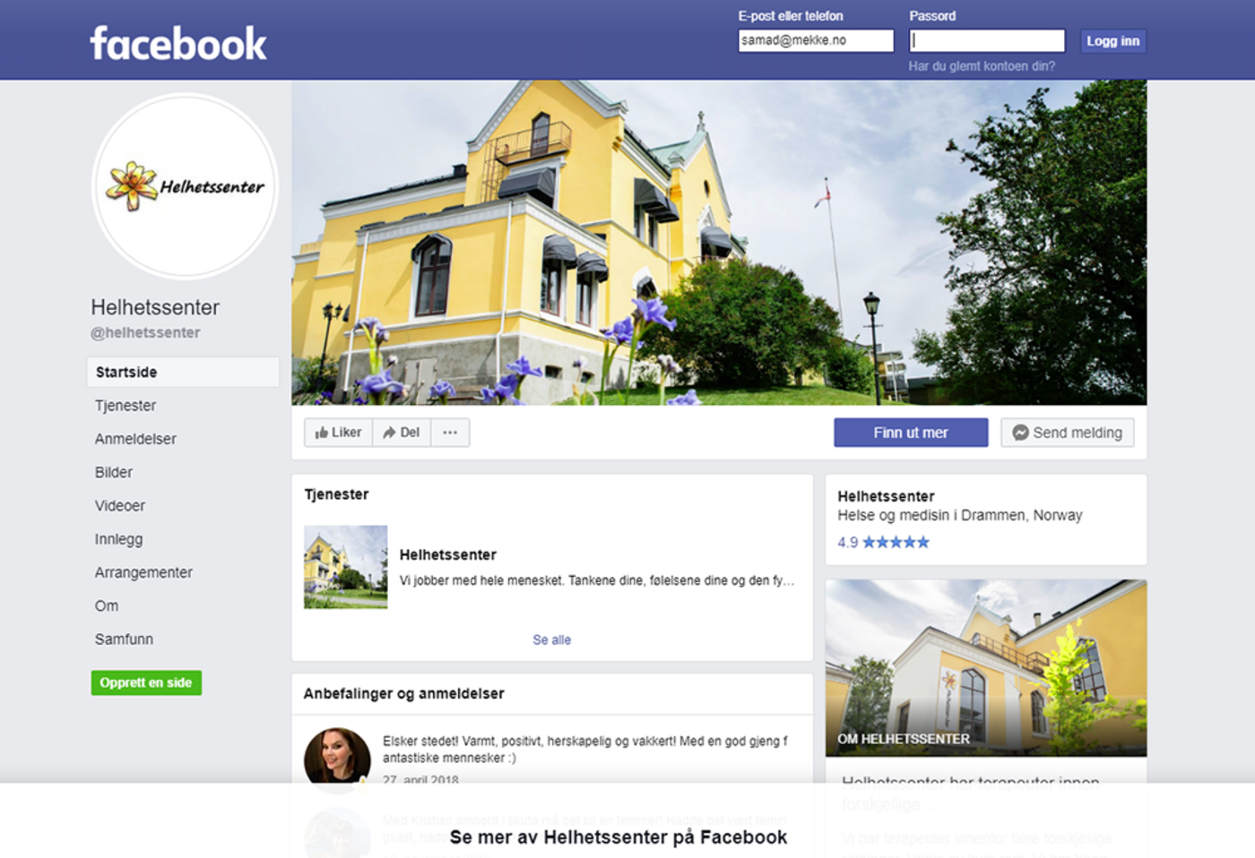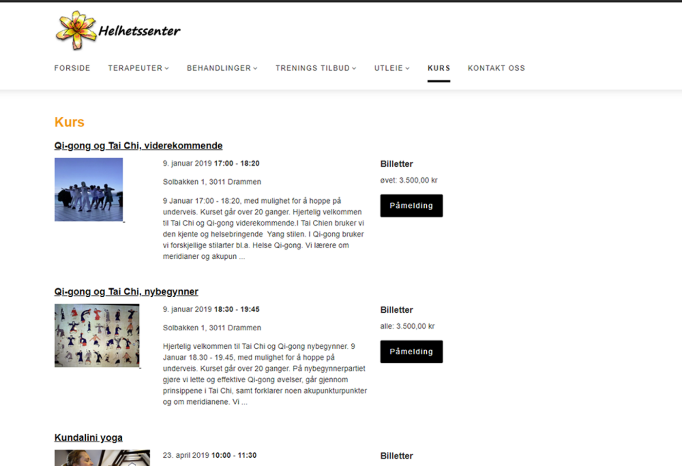 Helhetssenter bruker en standard Mekke-mal som er tilpasset kundens logo og design. De bruker aktivt vår arrangementsmodul.