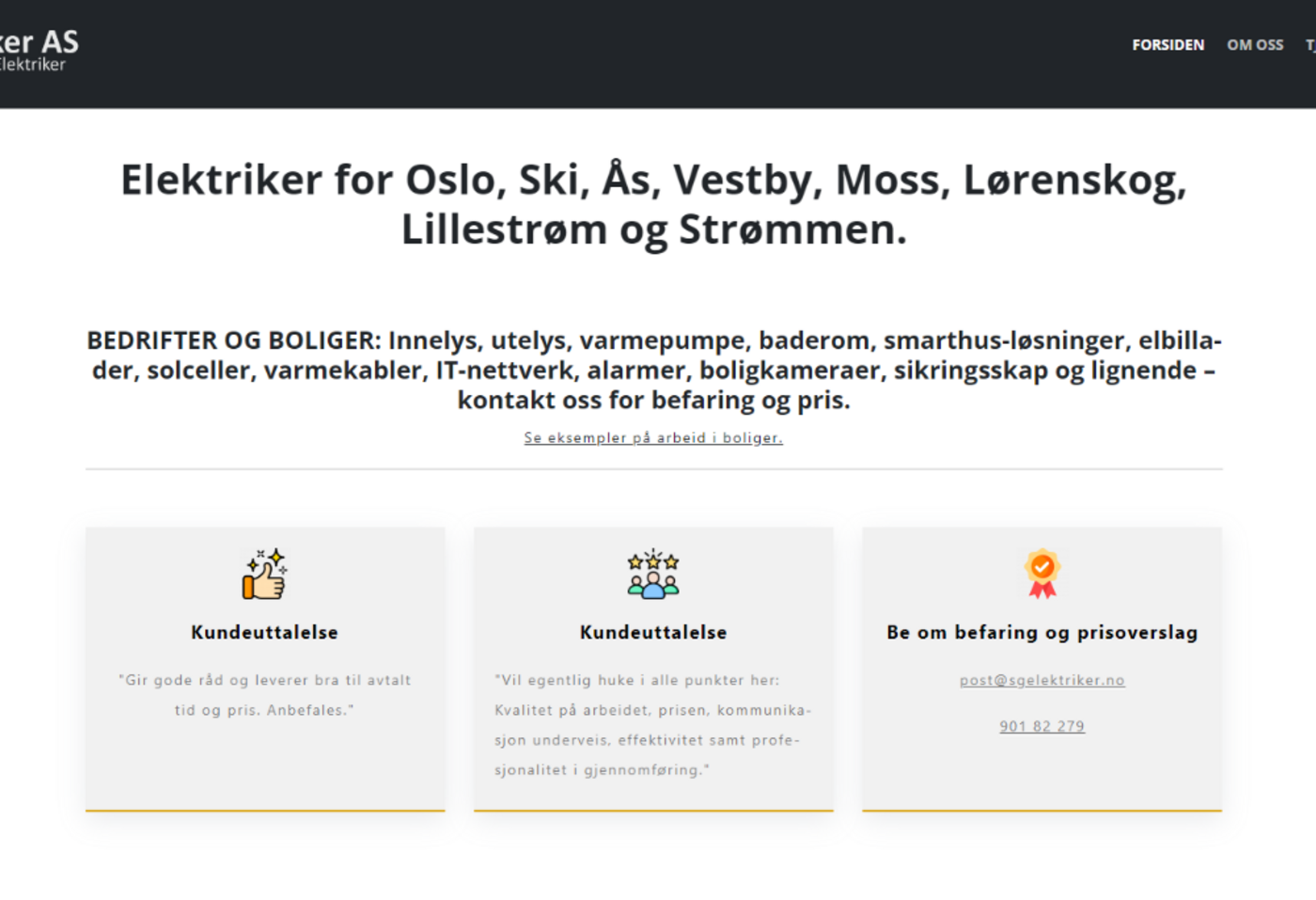 SG Elektriker AS Klikk her for å komme direkte til nettsiden og gå hit for å se hvordan den vises på en mobiltelefon. SG Elektriker AS bruker en one-page sidemal som er tilpasset kundens logo og design. Del denne siden med andre! Ditt navn: Din epost: Mottakers navn: Mottakers epost: Klarte ikke å laste inn Facebook-feeden.Klikk her for å gå til Facebook-siden vår!